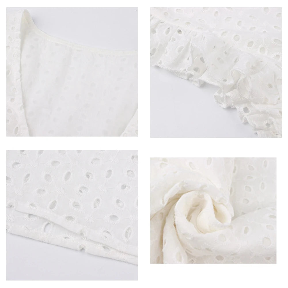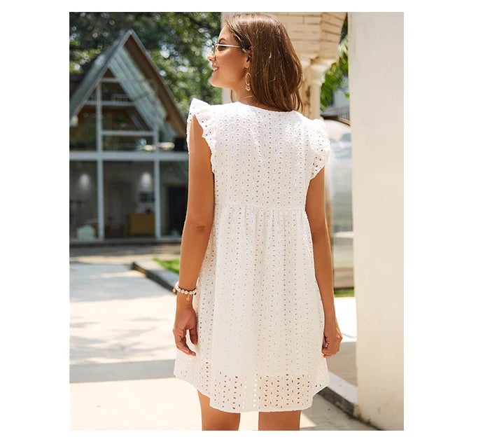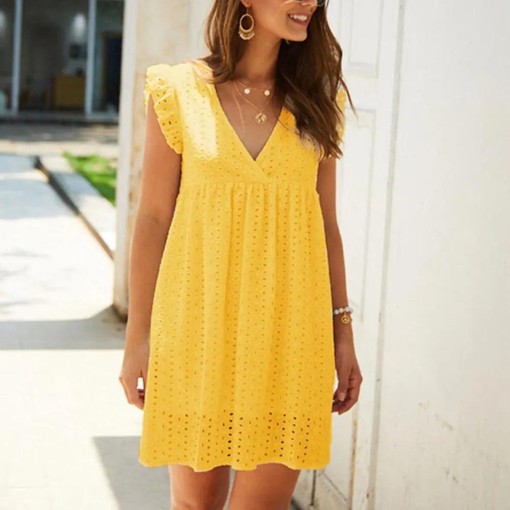 Cette robe en dentelle ajourée incarne la féminité et l’élégance. Son col en V profond met en valeur le décolleté tout en restant raffiné. Les motifs en dentelle ajoutent une touche sensuelle et sophistiquée, parfaite pour les journées d’été ou les soirées décontractées.